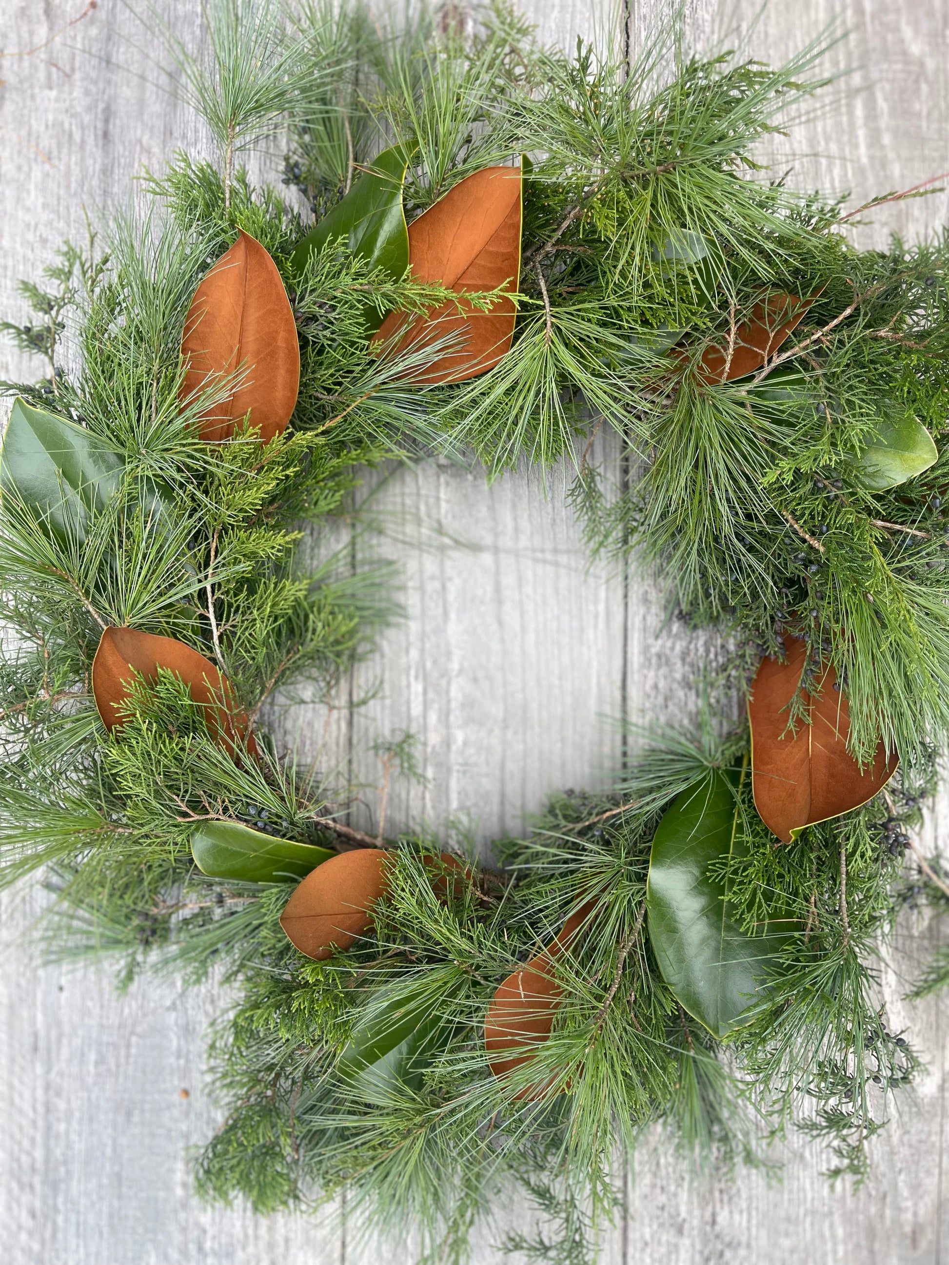 We offer two options: our Standard wreath, which includes a beautiful mix of greens as well as our Deluxe wreath, which features magnolia leaves and follicles (think of a velvety pinecone). You can opt for Polyanthemos Eucalyptus premium stems as an add-on to either wreath option as well.